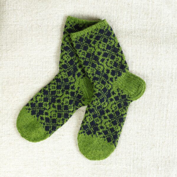 Käsitsi kootud villased mustrilised sokid. Suurus nr. 43-44.  Sokid on venivad seega on suurused orienteeruvad, mõõdetud venitamata. Kolmekordne lõng.